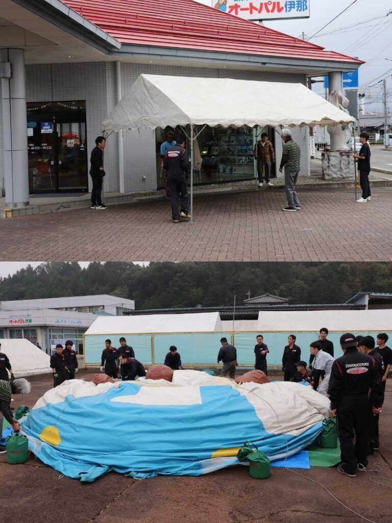 昨年同様、オートパル伊那店を会場にして行われた今回のオートパルまつり、各社員がそれぞれのコーナーに別れ、計画を進めてきました。時々雨のぱらつく中行われた前日準備の様子です。