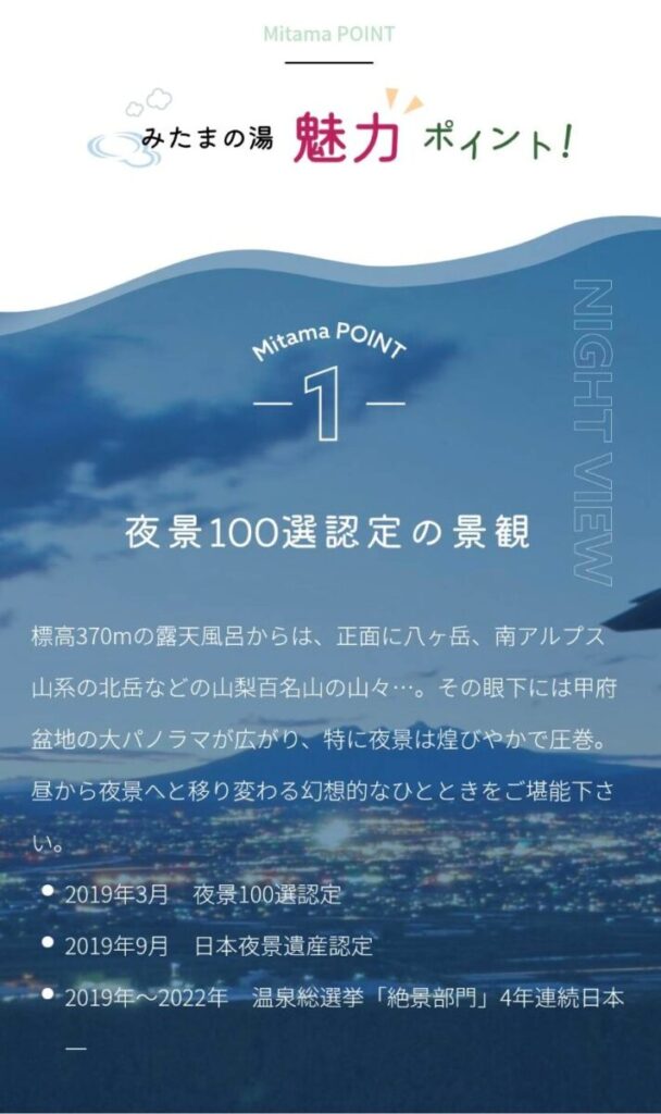 みたまの湯は甲府の南方から甲府の街を一望できる温泉です。その景色は温泉総選挙「絶景部門」4年連続日本一だそうです。