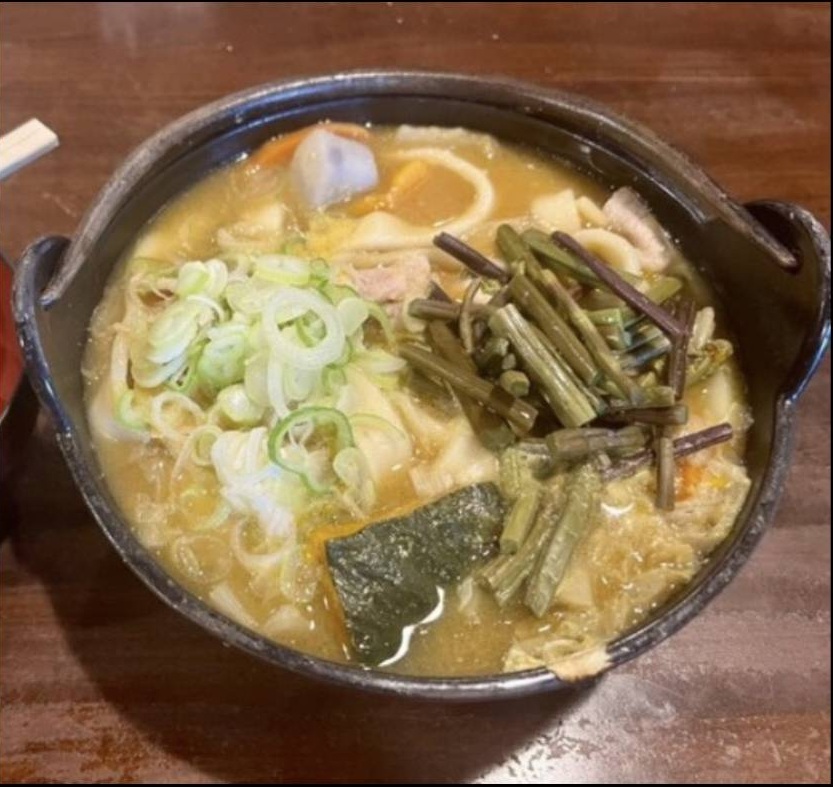 食べ応えのある太麺、ゴロゴロと煮た野菜や山菜、お肉が熱々の味噌のお汁と相まって体の芯から温まりました。