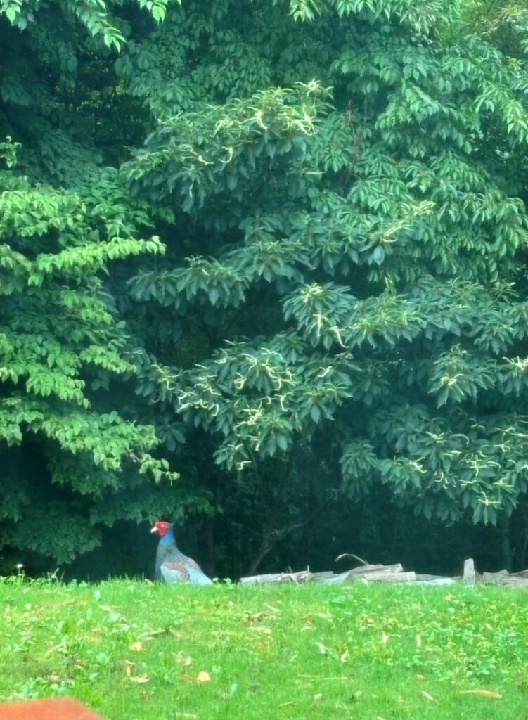 次の日の朝もスマホを手に、昨日の野生フクロウに会える事に期待してカーテンを開けてみると何とオスのキジが…?